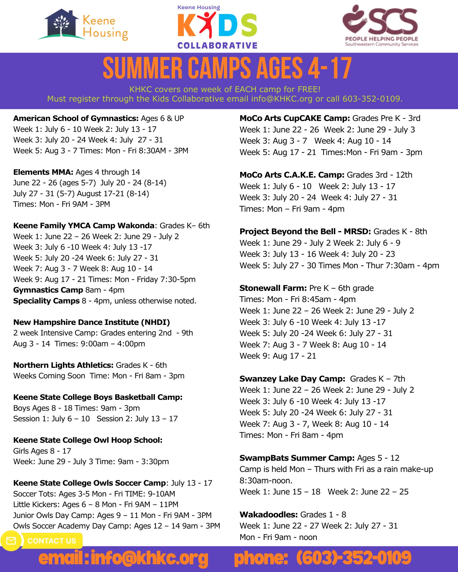 To the right is a list of some of our partners who offer activities your child can participate in. To find out more about the great opportunities we have available for your child give us a call at 603-352-0109 or email us at [email protected]. You can also stop by the Kids Collaborative office at Forest View Apartments, 5 Harmony Lane. We’d love to see you and talk about all the great things we have available for your child.